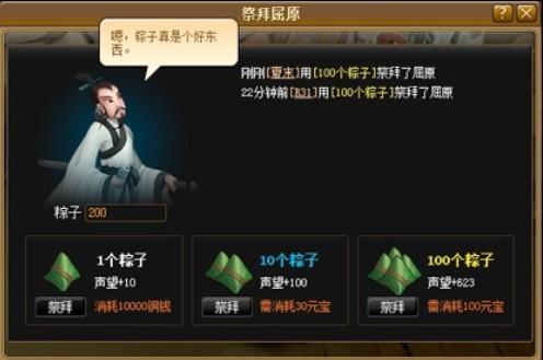 活动内容:消耗铜钱或元宝购买粽子祭拜屈原,玩家可以获得声望,每天只能祭拜一次