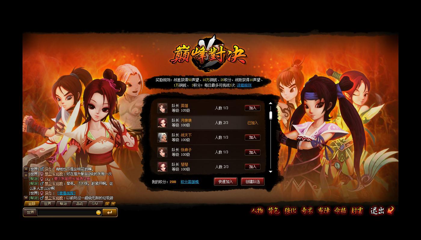 1.新系统“巅峰对决”:满足一定条件时,玩家间可组队相互进行PK,PK可获得积分,积分按照排名每周结算一次并发放相应奖励。